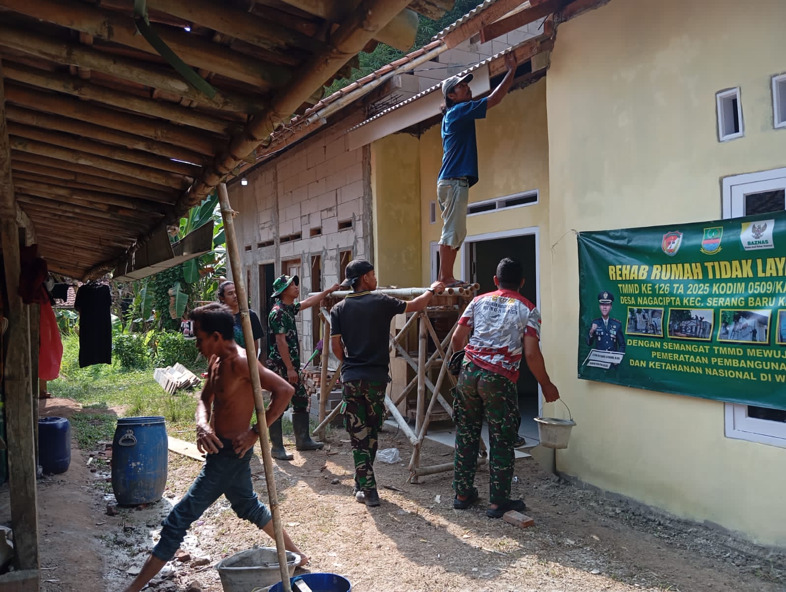 Bekasi- Satgas TNI Manunggal Membangun Desa (TMMD) ke-126 Kodim 0509/Kabupaten Bekasi memasuki hari ke-25 dengan progres signifikan. Kali ini, Satgas tengah menyelesaikan tahap finishing program Rumah Tidak Layak Huni (Rutilahu) di Kampung Tegal Sapi RT 03/02, Desa Nagacipta, Kecamatan Serang Baru, Kabupaten Bekasi, Minggu (2/11/2025).