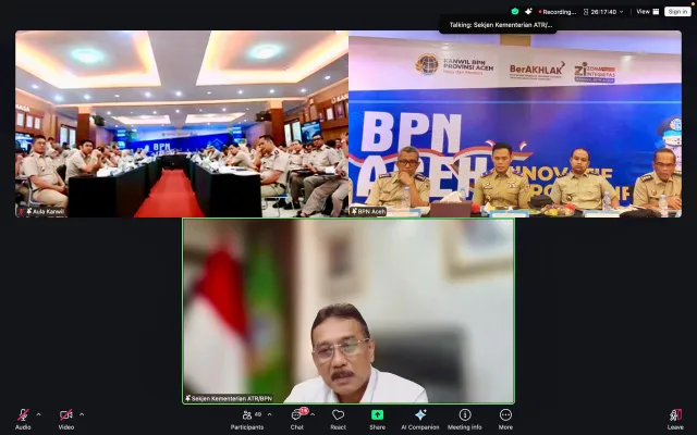 Jakarta – Sekretaris Jenderal Kementerian Agraria dan Tata Ruang/Badan Pertanahan Nasional (Sekjen ATR/BPN), Dalu Agung Darmawan, secara resmi membuka Rapat Kerja Daerah (Rakerda) Kantor Wilayah (Kanwil) BPN Provinsi Aceh yang dilaksanakan secara daring dan luring di Kanwil BPN Provinsi Aceh, Selasa (13/01/2026). Dalam arahannya, Sekjen ATR/BPN menegaskan perlunya evaluasi komprehensif terhadap pelaksanaan tugas dan program sepanjang tahun 2025, dengan penekanan bahwa capaian kinerja tidak boleh dipahami hanya dari sisi angka.
