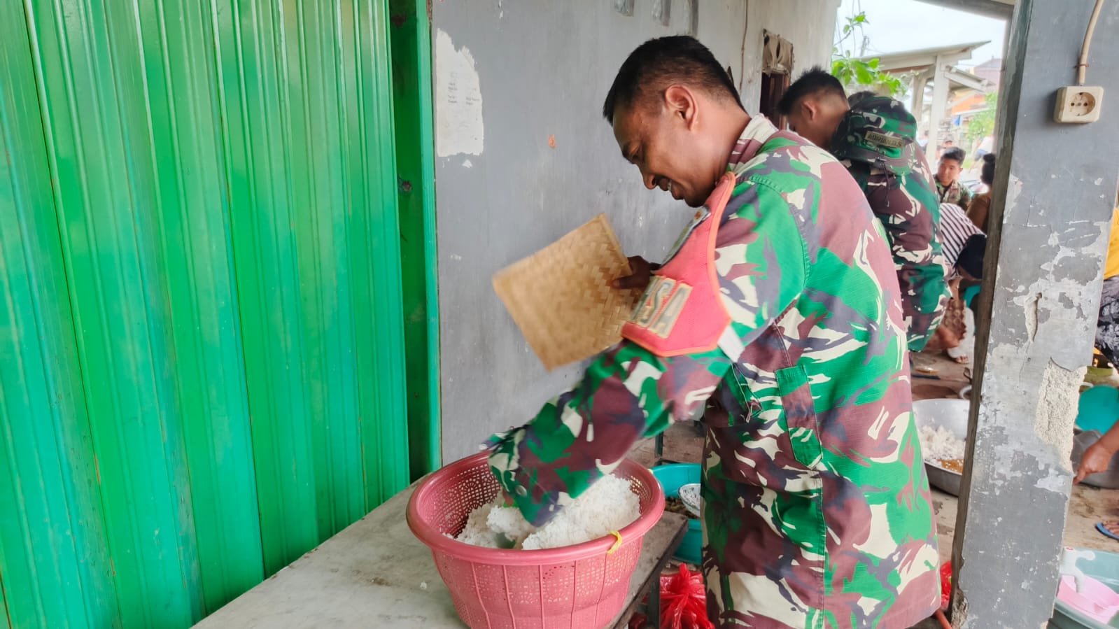 Babinsa bersama unsur TNI, Polri, dan perangkat desa turut membantu pendistribusian makanan dari dapur umum Desa Srijaya kepada warga yang masih terisolasi akibat tingginya debit air.
